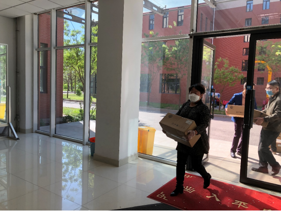2020年5月18日,万象城网页版_万象城(中国)党委书记王洪来、工会主席赵秀荣和工会干部们忙碌的身影穿梭于院学科楼内,为到岗复工的教职工配发口罩、消毒凝胶等防疫物品。