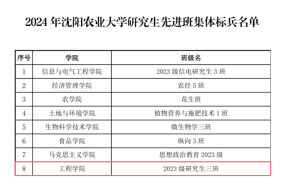 近日,研究生院(党委研究生工作部)公布2024年沈阳农业大学研究生先进班集体及标兵名单。根据《关于做好2023-2024学年度研究生评优表彰工作通知》,经班级申请,学院初评、推荐,学校评审,我院2023级研究生三班荣获2024年沈阳农业大学研究生先进班集体标兵。(万象城网页版_万象城(中国) 董瀚辰)